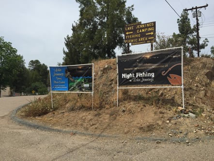 Wow, das sieht ja mal gut aus. Es ist Forellen-Saison! Hier läuft was. Auf dem Weg zum See sehen wir Schilder, welche Events für Fischer anpreisen. Fischen und Campieren sind beliebte Freizeitaktivitäten der Amerikaner. Am Lake Jennings können diese beiden Hobbys miteinander verbunden werden.