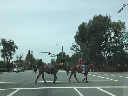 Unterwegs fühlen wir uns wie im Wilden Westen, als ein Cowgirl mit zwei Pferden die Strasse überquert. Irgendwie erinnert mich das Bild an das Beatles Cover von Abbey Road. Hinter uns fährt seit längerem der Sheriff, ob der uns verfolgt? HP macht ein cleveres Manöver um hinter ihn zu gelangen. Nun folgen wir dem Sheriff. Ich werde etwas nervös, als HP plötzlich wieder Anstalten zu einem Überholmanöver macht. In einer Hand hält er (also HP, nicht der Sheriff) seinen Frappuccino. Die Schlürfgeräusche übertönen sogar die Musik im Radio - sag mal geht's noch? Wo ist das Problem?.....Der Sheriff hört das Schlürfen ja nicht! Wir werden nicht verhaftet, der Sheriff hat aber das gleiche Ziel wie wir.