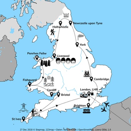 Wir starten mit einem Roadtrip um einen Teil DER Insel und erkunden dabei insbesondere die Küstenregionen von England und Wales. In England ist das Wetter erfahrungsgemäss sehr wechselhaft und im April sicher teilweise auch rau und kalt. Auch Wales ist nicht unbedingt als "Tropical Paradise" bekannt. Aber wie heisst es so schön; es gibt kein schlechtes Wetter, nur schlechte Ausrüstung. Damit wir auch bei struppigem Wetter komfortabel Reisen bzw. die Gummistiefel im Trockenen anziehen können, haben wir uns beim Mietauto für einen VW T6 entschieden. Der Name California ist Musik in unseren Ohren und die Ausführung Ocean hat sogar noch eine kleine Küchenzeile. Wir werden also kompakt alles dabei haben und können bequem auch in der Tiefgarage eines schönen Cityhotels parkieren. Im 2016 waren wir mitten im politischen Hick Hack anlässich der Brexit Abstimmung in England. Mitten drin statt nur dabei reisen wir am 30.03.2019, also am Tag nach dem Brexit, ein. Wir sind gespannt!