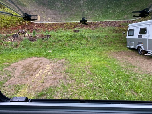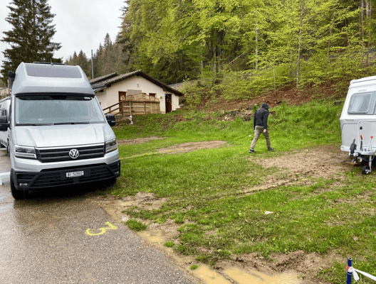 Auf dem Campingplatz angekommen, zeigt sich das Ergebnis des strömenden Regens. Unsere Parzelle ist sozusagen unter Wasser und nicht befahrbar. Wir bekommen die Anweisung, unser Fahrzeug VOR der Parzelle auf dem Asphalt aufzustellen. Das ist an sich eine gute Lösung aber H-P muss trotzdem durch den ganzen Schlamm laufen um die Stromversorgung anzuschliessen. Obwohl die sanitären Anlagen nur ein paar Schritte weg sind, werden wir jedes Mal beim Rausgehen vom Regen durchnässt und es ist kaaaaaalt draussen..... I hate Camping!