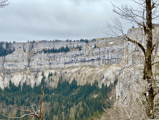 An der Grenze zwischen den Kantonen Neuenburg und Waadt im Val de Travers liegt die riesige Felsformation Creux du Van. Heute wäre passender Creux du Vent, denn als wir den Van parkieren, sehen wir, dass die anderen Wanderer fast umgepustet werden. Das Aussenthermometer zeigt 4.5 Grad an. Handschuhe habe ich leider nicht dabei aber genügend sonstige Bekleidung verteilt in den Mini-Schränken im hinteren Teil des Fahrzeuges. Im «Ich frier mir hier nicht den A.... ab»-Modus reisse ich eine wilde Kombination von Schichten raus. Kurzarmshirt, Langarmshirt, Fleecepullover, Regenjacke, Schal und Mütze. Zwiebelschalenprinzip vom Feinsten!