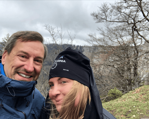 Wir laufen los und als wir an der Kante des Massivs ankommen, müssen wir uns entscheiden entweder zuerst hochlaufen und dann runter oder zuerst runter laufen und dann hoch. Der eisige Wind peitscht und weil das noch nicht genug ist, hat jetzt auch noch ein Sprühregen und Schnee Mix eingesetzt. Bäh, ich kann kaum die Augen offenhalten!