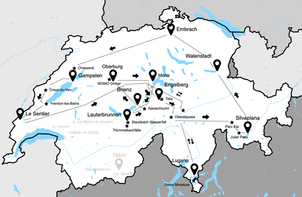 Weiter geht's, fertig chillen! Wir müssen schiesslich noch den verpassten Teil unserer Route nachholen! Das heisst mindestens einen Blick aufs Matterhorn erhaschen und das Château de Chillon bestaunen. Wenn möglich gleich noch die Kapplerbrücke in Luzern und den Piz Gloria besuchen. Das UNO Gebäude in Genf wär auch schon lange mal fällig. Schaffen wir alles easy heute Vormittag und dann noch kurz beim Willy vorbeischauen, bevor wir unseren Van in Lauterbrunnen parken.