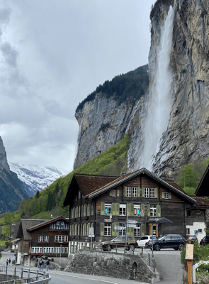 Wir sind ca. 30 Minuten hier und bereits so begeistert, dass wir fast ins Hyperventilieren geraten. Direkt hinter dem Campingplatz fallen riesige Wassermassen 300 Meter der Felswand entlang ins Tal hinunter. Das ist der Staubbachfall. Der höchste der insgesamt 72 Wasserfällen von Lauterbrunnen. Es ist sehr still hier, wir hören lediglich ein fernes, dumpfes Glockenläuten der Kirche. Durch die wenigen Touristen wirkt Lauterbrunnen ausgestorben und fast schon mystisch. Wir finden ein Pub mit Aussenbereich und essen eine hausgemachte Suppe zum Znacht.