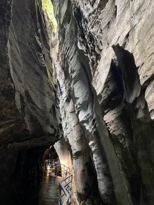 Der Weg durch die Schlucht führt über Stege und durch Tunnels und ist sehr gut unterhalten. Er kann von Gross und Klein mühelos zurückgelegt werden. Die breiteste Stelle der Schlucht misst 40 Meter, die schmalste Stelle jedoch nur gerade mal einen Meter. Genau an dieser Stelle habe ich beim Bilder knipsen meinen Rucksack an der Wand nach geschleift, der sieht jetzt aus, als hätte er eine Schlammpackung bekommen. Mal schauen wie ich den wieder salonfähig kriege.