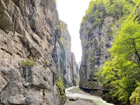 Heute arbeiten wir eine schon lange vor uns hingeschobene Pendenz ab. Wir besuchen die Aareschlucht und die ist von Brienz nur rund 15 Autominuten entfernt. Keine Ahnung, wo das sommerliche Wetter von gestern sich versteckt. Heute präsentiert sich alles grau in grau und es bläst ein kühler Wind. Brrr....zurück zum Tenue Zwiebelschale oder wie die Einheimischen hier sagen: Zibeleschale
