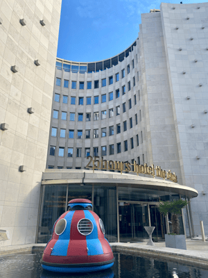 21.45 Uhr, also fast 10 h nach dem Take-off, landen wir im The Circle - 25hrs Hotel in Köln (genau; Tipp von Jonas, danke schön!). Wir sind begeistert! Von A - Z durchdacht und cool gestyled. Früher wurde das Gebäude vom Versicherungskonzern Gerling genutzt und die heutige Hotelloby war die Schalterhalle, in welcher die Versicherten ihre Prämien bar einbezahlt haben. Das Interior Design ist ein Spiel zwischen Retro und Zukunftsutopien. So steht z.B. direkt neben dem Telefon mit Wählscheibe ein futuristischer Bluetooth Lautsprecher. Nach einem Green Tel Aviv in der Hotelbar schlummern wir in zwei Sekunden weg!