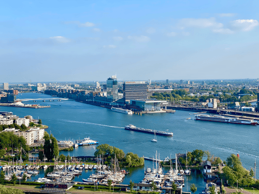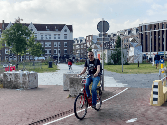 Mittlerweile macht sich die Kehrseite schon etwas bemerkbar, ist aber noch im grünen Bereich. Im Stadtteil De Pijp drehen wir ein paar Runden und finden uns plötzlich in einem riesigen Strassenmarkt wieder. Hier müssen wir leider absteigen und schieben (inoffiziell: Was für eine Wohltat für den Allerwertesten). Seit einiger Zeit sind wir nun auf sehr befahrenen Radwegen unterwegs. Von den mit den Kampf-E-Bikes vorbeiziehenden Velo-Profis lasse ich mich nicht beeindrucken. Die Räder mit Laderampen vorne drauf rollen teils donnernd wie LKW’s an uns vorbei. Es werden Stühle, Hunde, Bierfässer und weiss der Teufel was alles transportiert. Zum Glück halten die alle beim Vorbeifahren auch mindestens 2.75 cm Abstand und klingeln wie wild, damit ich sie auch kommen höre. Am Rotlicht stehen jeweils plötzlich 20 - 30 andere Fahrradfahrer um mich herum, bei grün geht das Rennen los. Um den Start so richtig anzuheizen, zählt die Ampel auch noch die Sekunden als Countdown rückwärts. Habe ich schon erwähnt, dass ich Rotlicht mittlerweile super finde? Das gibt einem die Möglichkeit kurz zu stehen....wtf....zuhause hätte ich so Hosen mit eingenähten Polstern.