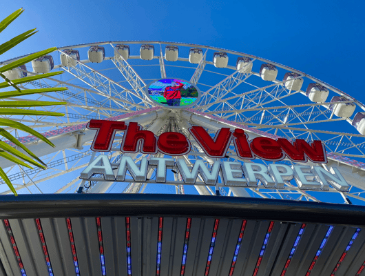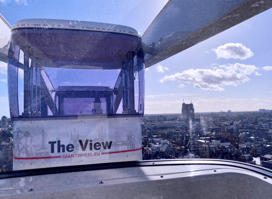 Wow! Hier steht ein Riesenrad und es steht THE VIEW drauf. Ohne viel nachzudenken schlage ich vor, zwei Tickets zu kaufen. H-P runzelt die Stirn und sagt, krieg oben bloss nicht die Krise. Ich habe Höhenangst und wenn die losgeht, kann’s mühsam werden für die um mich herum und für mich selber auch. Übermütig, bezahle ich die total EUR 16 (Wunsch-Joker noch nicht eingelöst) und sage, sind ja nur zwei Runden, zudem bekommen wir eine eigene Gondel. Es steht ja sonst niemand an. Auf dem Bänkli sitzend, geht die Fahrt los. Das flaue Gefühl setzt etwa auf halber Höhe ein. Wieso auch immer, bleibt das Riesenrad am obersten Punkt auf 55 Meter stehen und fährt eine gefühlte Ewigkeit nicht weiter. Vermutlich steigen weitere Passagiere ein. Der Wind pfeift durch die Öffnungen, herrje. Eine Bootfahrt hätte es auch getan. Schön geradeaus schauen, nur nicht ruuuuunterschauen! Ahhhh, es fährt wieder. Noch maximal zwei Runden. Was? Der Herr im Kabäuschen gibt per Lautsprecher durch: „Extra Ronde!“ Na bravo vielen Dank! Nochmals; „Extra Ronde!“ WTF! Kurz zusammennehmen und fürs Selfie in die Kamera lächeln. Schön war’s und jetzt aussteigen!