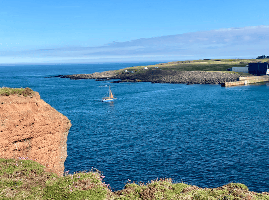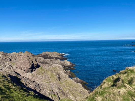 Weiter geht’s, das heutige Ziel ist Eyemouth! Die Schotten ziehen wettermässig alle Register um uns willkommen zu heissen. Der Blick auf die Küste ist grandios. Bei knapp 18 Grad und stahlblauem Himmel checken wir im Holiday Park ein. Bis und mit Begrüssung ist alles vom Feinsten. Je weiter wir in den Park hineinfahren, desto gerunzelter sind unsere Stirnen. Wir sind in Familie Flodders Caravan Park gelandet. Hunderte zum teils richtig abgehalfterte Ferienhaus-Container stehen rum. Mittendrin hat’s einige wenige Stellplätze, die Nr. 3 ist für uns reserviert. Es ist eng und eine Bezeichnung oder Begrenzung der Parzelle fehlt. Gemäss Plan parkieren wir und richten uns ein. Die Facilities sind ein Gräuel, ich schreib lieber keine Details. Die Website und auch die Bewertungen klaffen meilenweit auseinander von dem, was wir hier antreffen. Wir ziehen die Wanderschuhe an und laufen der Küste entlang um Frischluft zu tanken und uns Optionen zu überlegen. Der Blick auf die Nordsee ist auch hier atemberaubend! WOW!