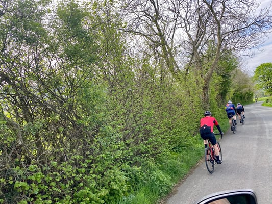 Wir erspähen eine Kreuzung und denken, raus aus dem Tohuwabohu! Zäck abgebogen kommt etwa nach 200 Metern ein Schild: Maximal 2 m Fahrzeugbreite darf hier durch. Shit, das auch noch! Wir haben 2.44 m. Passt nicht, also das Ganze retour. Rückwärts zurück ins Velorennen. Hinter uns bildet sich schon ein Stau, ein Herr meint, wir sollen einfach weiterfahren (super Idee, danke!). Dann quetscht er sich mit seinem Clio an uns vorbei. H-P hat Nerven wie Drahtseile, ich meine bemerkt zu haben, dass sie in dieser Situation ein wenig geflattert haben. Ein netter Herr merkt, dass wir in Not sind und blockiert mit seinem Range Rover die komplette Strasse. Wir können so zurücksetzen und uns wieder auf die ursprüngliche Strasse begeben. Alle halten an, auch die Velofahrer. Das Beste: Keiner reklamiert oder flucht. Die trinken einen Schluck und fahren easy ihr Rennen weiter! Statt 30 Minuten waren wir weit über eine Stunde, man könnte sagen als Rennveranstaltungs-Begleitfahrzeug, unterwegs.