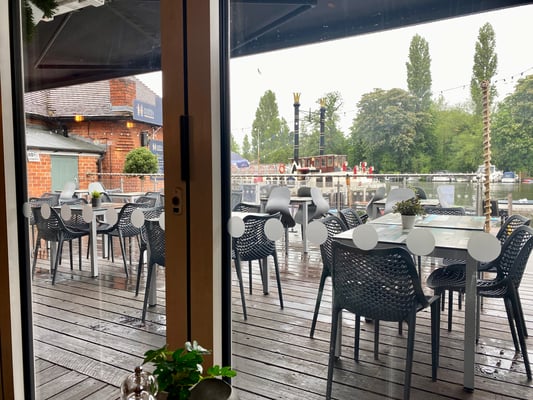 Am Vormittag Ausflug nach Henley-on-Thames und ein letztes «Full English Vegi» zum Frühstück. Wir sitzen im wunderschönen Bistro, sind ganz alleine, haben einen Tisch mit Blick aufs Wasser und die regennasse Terrasse. Ja genau, es schifft in Strömen, so stark wie auf der ganzen Reise bisher nie. Es ist richtig grüsliges Wetter, wir sind gefühlt die einzigen Touristen in der historischen Altstadt und es fahren heute nicht mal die grossen Ausflugsschiffe! Bähhhh, ich sag nur Regenponcho!