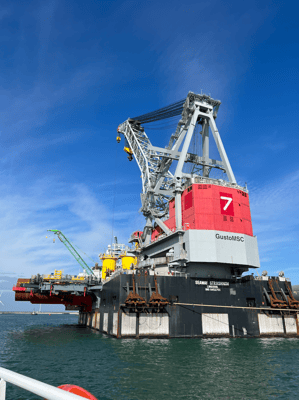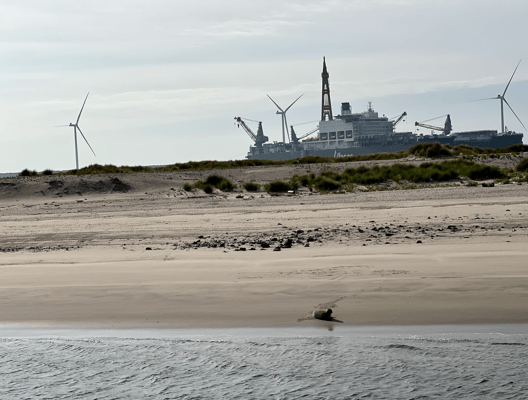 Wir sehen das «grösste Fahrzeug» der Welt, die Pioneering Spirit. Das ist ein Schwergut- und Pipeline-verlegendes Arbeitsschiff des schweizerischen Offshore-Dienstleisters Allseas. Das Schiff (Flagge Panama und Malta) ist das weltweit größte Arbeitsschiff und überdies das größte jemals gebaute Schiff nach Bruttoraumzahl und Breite. Der 3 Mrd. USD teure Koloss ist 382 Meter lang und 123 Meter breit. Eine 571 Mann/Frau-starke Besatzung ist darauf im Einsatz. Weitere krasse Zahl: 1 km verlegte Kabel/Pipeline kosten unglaubliche EUR 6 Mio.