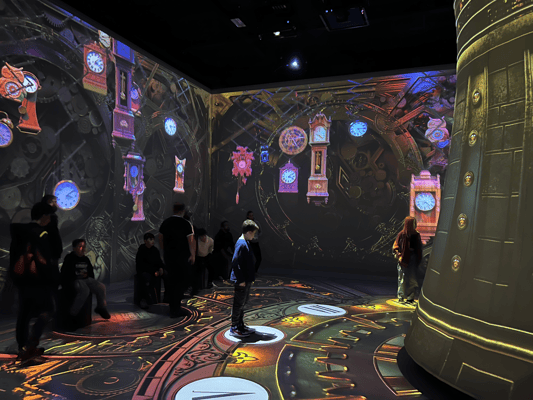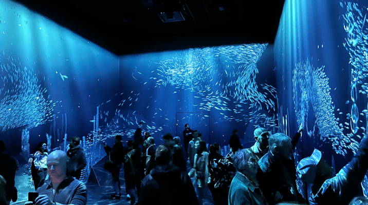 Auf geht’s zu REMASTERED! Werbung für diese Ausstellung aka Event haben wir im letzten Herbst schon gesehen, hatten jedoch damals keine Zeit oder besser gesagt, andere Prioritäten. Immersive Kunst ist ein riesiger Trend in der Kunstszene. Pixel ersetzen sozusagen Pinselstriche. Hier haben die besten niederländischen Digitalstudios neue Welten geschaffen und das Beste daran ist, als Besucher taucht man direkt ein! Eingebettet ist REMASTERED in den Sockel der Erasmusbrug und in verschiedenen Räumen sind auf mehr als 1'000 m2 über 60 hochmoderne Beamer und 50 Lautsprechen installiert. Gebeamert wird volle Kanone: 245 Millionen Pixel! Wir laufen durch einen Wasserfall, tauchen in eine interaktive Unterwasserwelt ein. Die Fischschwärme und Pflanzen reagieren auf die Bewegungen der Besucher, fühlt sich an wie tauchen ohne Taucheranzug! In einem Lift, der sich in Realität vermutlich keinen Meter bewegt hat, fahren wir in rasantem Tempo in den Himmel. Dort laufen wir durch die Wolken und müssen aufpassen, dass die Vogelschwärme uns nicht abschiessen. Irgendwann landen wir in einem riesigen Raum und hier geht die Post so richtig ab. Überall tolle digitale Projektionen in kräftigen Farben, reingeschummelte Elemente von Van Gogh, Rembrandt und Co. und alles brutal gut unterlegt mit fetten Tunes vom niederländischen Star DJ Sam Feldt. Es gibt kein Halten mehr von Jung bis Alt grooven alle mit, wohlgemerkt es ist Mittagszeit! Was für eine Party. Nach einem Cooldown geht’s zurück in die reale Welt und ich freue mich riesig, als ich den von mir zu Beginn mit Filzstift ausgemalten Luftballon auf dem riesigen Screen rumfliegen sehe!