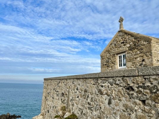 Online habe ich auf der Karte zwar nichts gefunden, aber wenn ich Glück habe, gibt’s unterwegs eine Möglichkeit zum Einkehren. Im Rucksack immer dabei: Ein Sandwich, einen Apfel und Mandeln. Heisser Tee im Yeti und eine Flasche Wasser gehören auch noch zur Ausrüstung. 4 x sehe ich heute andere Wanderer, sonst bin ich alleine unterwegs. Kein Restaurant oder ähnliches in Sicht, darum esse ich unterwegs meinen mitgebrachten Proviant. Das Wetter ist zwar wunderschön, der Wind aber mittlerweile richtig bissig. Ohne Mütze geht’s nicht und lang auf den kalten Felsen sitzen, ist nicht wirklich angenehm. Also lieber weiterlaufen! Den Rückweg kürze ich etwas ab und laufe oberhalb der Küste, in der Nähe der Strasse. Zum Schluss mache ich noch einen Abstecher auf «The Island», den äussersten Landzipfel von St Ives. Windgeschützt sitze ich an einer Mauer der kleinen Kirche in der Sonne, trinke die letzten Schlucke Tee und schaue auf den Porthmeor Beach runter.