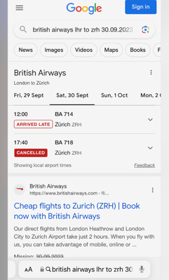 British Airways hat folgenden Lösungsvorschlag für uns: Morgen 07.55 Uhr also 1 Tag später als geplant und mit Zieldestination Basel statt Zürich. Sie halten fest, dass sie für Kosten, welche für die Fahrt zwischen Basel und Zürich entstehen, nicht aufkommen. Unterkunft für eine Nacht sollen wir bei Bedarf selber organisieren, es gibt ein Formular, mit welchem Rückerstattung für solche Kosten beantrag werden können.