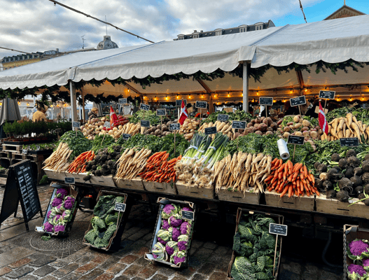 Nächster erwähnenswerter Stopp sind die TorvehallerneKBH. Zwei Glashallen mit rund 60 Food Ständen. Die Waren sind aufwändig präsentiert und wären wir nicht schon frühstücken gewesen, wäre das the place to eat. Es fängt grade an zu graupeln und die kleinen Eiskügelchen bedecken innert Minuten die komplette Strasse. Von Sonnenschein, bis grau in grau und weiss gezuckert in einem Wimpernschlag. Das Wetter kann uns gar nix! Wir sitzen draussen an einem Bistrotisch unter einem Sonnenschirm, trinken einen heissen Kaffee und eine Magic Mylk – für die Abwehrkräfte! Das Geräusch, welches die Graupel auf dem Sonnenschirm machen ist irgendwie hypnotisierend.