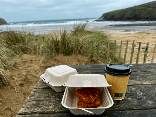Mit Trekkingschuhen, Rucksack, warmem Tee und Regenjacke ausgerüstet, fahre ich mit dem Auto zuerst zum knapp 1 h entfernten Poldhu Beach Cafe. Bei den Einheimischen bestens bekannt als ein Beach Place to be, habe ich hier noch nie offensichtliche Touristen getroffen. Heute früh bin ich sogar der einzige Gast, denn das Wetter ist sehr bescheiden. Es windet brutal und fegt mir fast das Frühstück vom Holztisch! Aber wir wissen es; es gibt kein schlechtes Wetter....