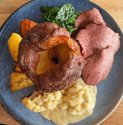 Der Braten wird mit Gemüse, Bratkartoffeln, einem Yorkshire Pudding und dickflüssigem Gravy serviert. Der Yorkshire Pudding ist kein Dessert und hat auch mit Black Pudding nichts zu tun. Er besteht aus Eiern, Mehl und Milch, wird im Ofen so lange gebacken, bis er wie ein Ofenküchlein aufgeht und knusprig, luftig und leicht ist. Die Bratensauce (Gravy) wird vom Yorkshire Pudding perfekt aufgesaugt, eine grandiose Kombination!