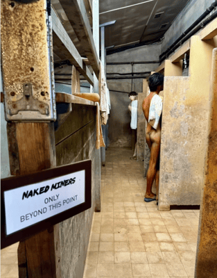 Es war ein brutaler Job, dem sich die Männer jeden Tag stellten. Ich denke, wir bekommen zwar eine Idee davon, können uns aber die körperliche Belastung nicht im Geringsten vorstellen. Eine Schicht unter Tag dauerte 8 h, für die die Bergarbeiter im Verhältnis zu anderen Berufen sehr gut bezahlt wurden. Vor der Schicht mussten sie aber noch zwei Stunden runterfahren sowie absteigen zum Arbeitsort und nach der Schicht wieder den ganzen Weg zurück. Der Arbeitsort war hier dann gut und gerne 21 Ebenen tiefer und 600 Meter unter dem Meeresspiegel. Für den Hin- und Rückweg wurden sie nicht bezahlt. Es war eng, dunkel, feucht, entweder sehr kalt oder zu warm, aufrecht stehen war nur an wenigen Stellen möglich. Zurück in den Umkleideräumen, haben die Arbeiter lange und heiss geduscht und bekamen zur Erhaltung der Gesundheit einen Multivitamin Cocktail aus verschiedenen Tabletten z.B. hochdosiertes Vitamin C. Die ganzen Klamotten wurden ordentlich aufgehängt und am nächsten Tag wieder angezogen.