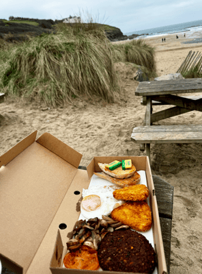 Ich war zwar letzte Woche schon da, aber Wanderkilometer gibt’s auf der Lizard Halbinsel genügend. Wir machen nicht nochmals die gleiche Route, sondern laufen ab Lizard Point genau in die entgegengesetzte Richtung. Davor tanken wir noch Treibstoff in Form eines Full English Vegi Breakfast. Oh Mann! Das gebratene Linsen, Karotten, Erbsen Patty ist so fein!