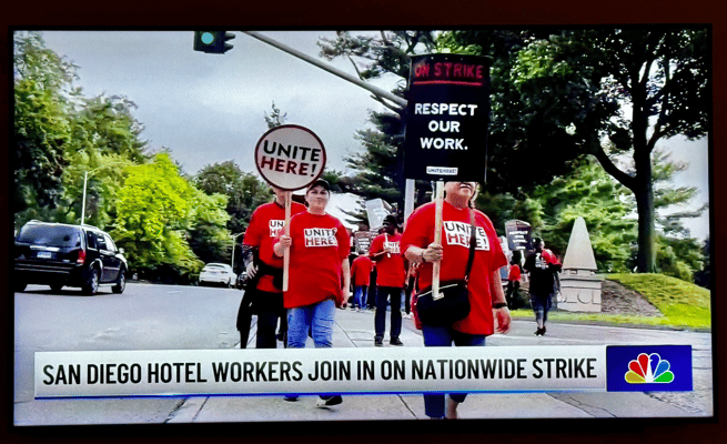 Sie sind laut, energisch und haben aus unserer Sicht auch Gehör verdient. Die Mitarbeitenden diverser Luxushotels in SD kämpfen für eine Lohnerhöhung. Sie sind nicht alleine. Landesweit beteiligen sich aktuell rund 10'000 Angestellte, vornehmlich Reinigungspersonal, am Streik. Aufgrund der tiefen Löhne reicht ein Job nicht aus, um das Leben zu finanzieren. Viele können mit dem Lohn vom Hotel gerade die Miete bezahlen, obwohl sie Vollzeit arbeiten. Deshalb müssen sie nach der ordentlichen Arbeitszeit weitere Jobs annehmen, um das fehlende Einkommen für den Lebensunterhalt zu generieren. Die Zahlen der Branche zeigen, dass die Hotelkonzerne richtig fette Gewinne machen und ihre Mitarbeitenden leider nichts abbekommen.  Die Streikzone liegt übrigens auf unserer Veloroute. Wir fahren also jeweils mitten durchs Getümmel durch, natürlich ganz vorsichtig!