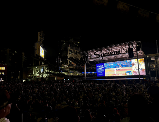 An der Watch Party werden Auswärtsspiele im ans Stadion angrenzenden Park auf Grossleinwand übertragen. Dieses Format haben wir dieses Jahr das erste Mal besucht, ein riesen Erlebnis! Für USD 5 kann man sich ein Ticket kaufen. Alle bringen ihre Wolldecke mit, setzen sich gemütlich hin oder stehen irgendwo rum. Der Event ist moderiert, das Padres Animations-Team sorgt für gute Stimmung, es hat Food-Stände und das Gemeinschaftsgefühl ist fantastisch. Als die Padres die Dodgers auch noch 10: 2 bodigen, gibt’s kein Halten mehr! Die gelben Tücher werden bis kurz vor Schulterauskugelung geschwungen.