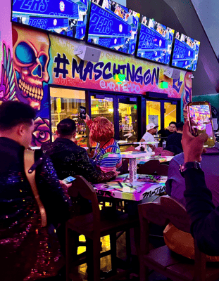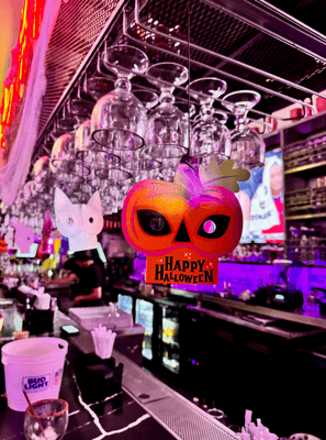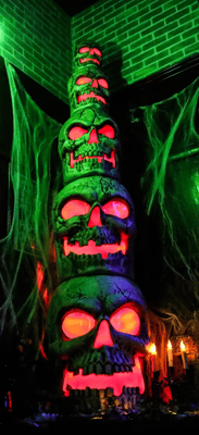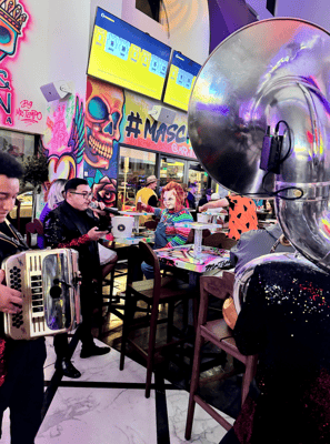 Wir nippen an zwei wunderbaren Margaritas! Spicy, spicy und direkt neben uns steht der Mariachi Sänger und singt für Chucky die Mörderpuppe ein Liebeslied. Den Text kann er nicht auswendig, er liest vom iPhone ab. Gitarrist, Schlagzeuger, Sousaphonist und Handorgelist :-) gehen ab wie ein Zäpfli. Ein Ultra-Kurz-Video habe ich unten eingefügt (Lautstärke voll aufdrehen). Heiliger Habanero-Chilli, zu geil um wahr zu sein! We love Halloween....und die Mexican Culture ebenfalls!
