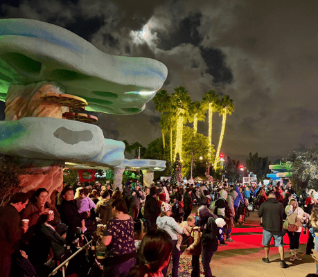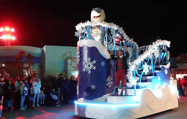 Habe ich schon Santas Renntiere erwähnt? Die haben wir auch besucht. Der Tag vergeht wie im Flug, mittlerweile ist die Sonne untergegangen und wir sehen, dass die Weihnachtsdekoration in Sea World alle Superlative sprengt. Für südkalifornische Verhältnisse weht eine eiskalte Brise und ich kaufe mir einen Weihnachtspullover als zusätzliche Wärmeschicht. Auch einer kitschigen Halskette mit blinkenden Lebkuchenfiguren kann ich nicht widerstehen. H-P ist nicht in Weihnachts-Schnick-Schnack-Shopping-Stimmung. Haben wir den Grinch entlarvt? In 45 Minuten beginnt die legendäre Christmas Parade, die an ausgewählten Tagen bis Weihnachten stattfindet. Wir wissen nicht genau, wo die Route verläuft und setzen uns auf eine Mauer, um einen heissen Chai Latte zum Aufwärmen zu schlürfen. Da setzt sich eine junge Mutter mit ihrer Tochter zu uns und spricht mich auf die blinkende Kette an. Beide tragen auch Weihnachtspullover und wir erfahren, dass wir uns unwissentlich auf die beste Mauer für die Parade gesetzt haben. Wie ist die Parade? Wooooowwww! Amerikanisch kitschig, überall blinkt es, absolut mega cool und perfekt inszeniert mit Musik, Tanz und Show! Die Elfen haben Weihnachten gerettet, alles wird gut!