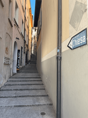 Bevor es zum Essen geht, haben wir noch eine kleine sportliche Mission: Über 400 Stufen führen hoch zur berühmten Kirche Santa Maria del Sasso. Der Ausblick soll atemberaubend sein – und das wollen wir uns natürlich nicht entgehen lassen.