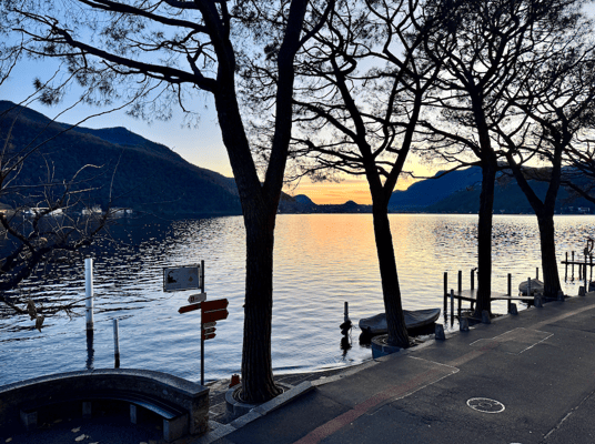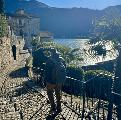 Und dann, oben angekommen: Bääämm! Was für ein Ausblick! Der See glitzert in der Sonne, die sanften Hügel des Tessins ziehen sich bis zum Horizont und irgendwo bimmelt eine kleine Glocke. Diese Schweiz – sie kann einfach unfassbar schön sein. Für genau solche Momente lohnt sich jeder Höhenmeter.