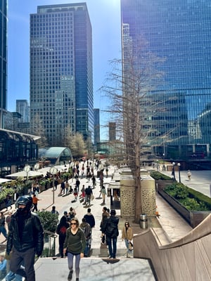 Rund 105’000 Menschen arbeiten in Canary Wharf – die meisten für Banken und Finanzdienstleister. Doch auch Medienhäuser, Techfirmen und Start-ups haben in den letzten Jahren Gefallen an diesem Ort gefunden. Wir befinden uns also mitten in einer der dynamischsten Drehscheiben der Welt. Voll cool!