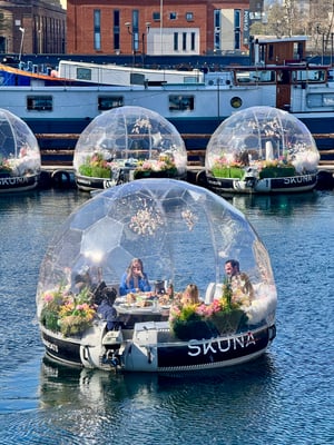 Im London Museum Docklands tauchen wir in die Geschichte des Hafens ein. Schon das denkmalgeschützte georgianische Lagerhaus aus dem 19. Jahrhundert beeindruckt uns. Was hier in den florierenden Zeiten alles abging – das ist spannend, eindrücklich und teilweise schockierend zugleich. Kaum treten wir aus dem Museum, entdecken wir ein schwimmendes Plastik-Iglu: Eine fröhliche Gruppe lässt sich auf dem Kanal herumfahren – beim Fondue! Fantastisch! Als ein riesiges Gejohle losgeht, schauen auch wir von der Brücke ins Wasser und trauen unseren Augen kaum. Die Gruppe Jungs schlägt dem Kahn den Boden raus, die Menschenmenge applaudiert!