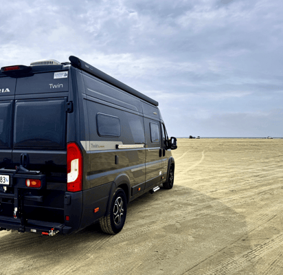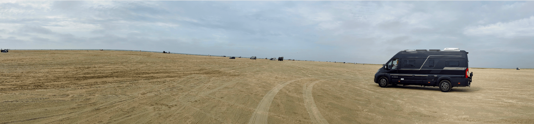 Weiter geht’s nach Lakolk Strand. Wir merken zunächst gar nicht, dass wir bereits direkt beim Campingplatz sind. Wieso? Wir haben im Navi den Strandabschnitt eingegeben, auf dem man - also alle anderen auch - direkt mit dem Fahrzeug auf den Sand fährt. Vielleicht sind wir noch etwas high vom besten Hot Dog ever. Klingt verrückt? Vielleicht. Aber der Sand ist so fest, dass er selbst unseren 3.5-Tonnen-Pottwal alias Camping-Van problemlos trägt. Nein, wir haben keinen 4x4, aber wir sind ja auch nicht die Schwersten am Strand.