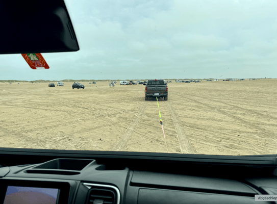 Wir plaudern noch etwas mit ihm. Sein Tipp: Nur auf sehr dunklem Sand fahren – und nie dort, wo Muscheln liegen! Er empfiehlt uns ausserdem zwei coole Events am Strand – leider sind wir dann schon wieder weitergezogen.