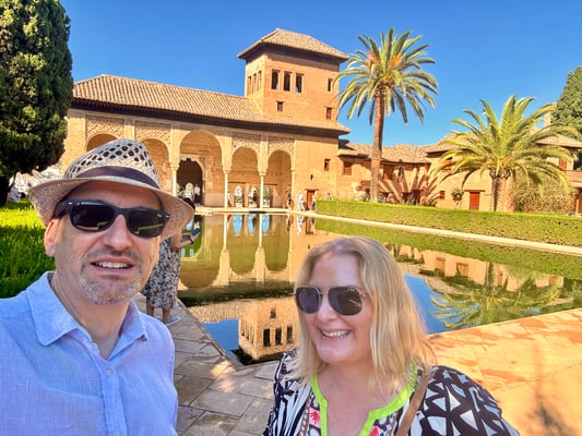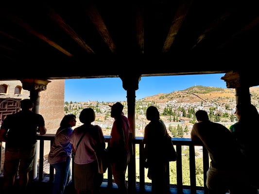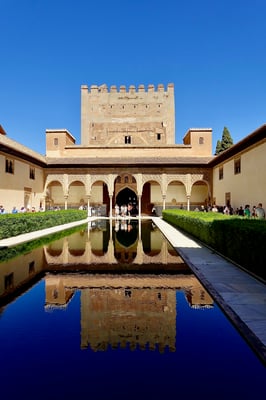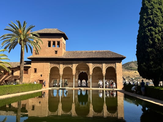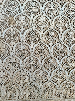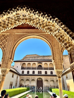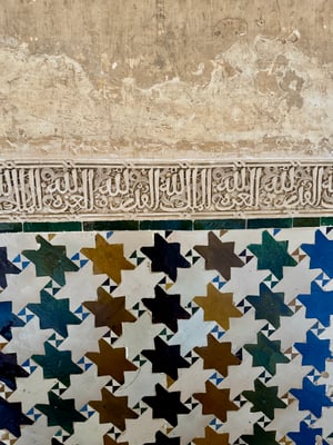 Das grosse Finale startet um 13.00 Uhr: Die Nasridenpaläste! Pünktlich stehen wir in die Menschenschlange ein, Ticket und ID werden kontrolliert, grünes Licht, wir dürfen rein! Ab diesem Moment sind wir sprachlos, ehrfürchtig, geflasht. Aufwändig verzierte Säulen, farbenfrohe Kacheln, filigrane Arabesken, schwindelerregende Raumhöhen. Mosaike so fein, dass das Auge kaum folgen kann. Innenhöfe mit Wasserflächen, die wie gemalt wirken. Alles von Hand, vor Jahrhunderten erschaffen - unbegreiflich!