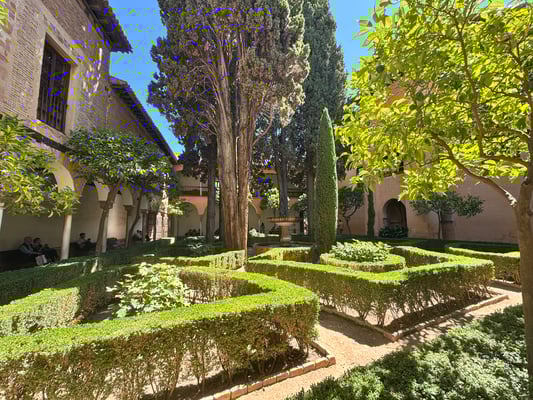 Wir sind früh da, gönnen uns zuerst in der Alcazaba einen starken Kaffee und ein Croissant mit Blick über Granada. Dann flanieren wir in Ruhe durch die Highlights. In den Gärten ist es aktuell mit 25 Grad noch verhältnissmässig kühl.