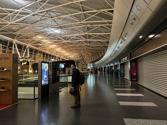 Normalerweise wird man ja gnadenlos durch den Duty-free-Bereich geschleust. Heute: nichts. Alles noch geschlossen. Auch der Passagierbereich wirkt noch leicht verschlafen, die komplette Beleuchtung ist nicht mal eingeschaltet. Wir laufen im Halbdunkel den Schildern Richtung E-Gates und Passkontrolle nach. Es fühlt sich ein bisschen wie im Vorspann eines Thrillers an.