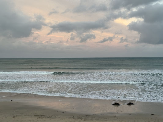 Frühstücken mit Blick auf die Wellen ist ein absolutes Privileg, wir könnten hier stundenlang sitzen und den Surfern zuschauen. Die Wassertemperatur liegt aktuell bei 12 Grad. Aus eigener Erfahrung wissen wir: Das ist kalt. Nein, brutal kalt. Und das selbst mit guter Ausrüstung. Das Wasser, das einem beim Paddeln ins Gesicht spritzt, fühlt sich an wie tausend kleine Nadelstiche. Dieses Jahr lassen wir es bleiben.