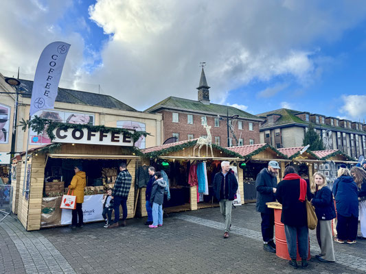 Die kleine Altstadt ist am Vormittag schon prall gefüllt mit Leben. Weihnachtseinkäufe überall, bei Marks & Spencer brummt der Bär. Wir bummeln über den Weihnachtsmarkt, und wie die Briten so sind: viele Menschen, aber null Hektik. Alles wirkt erstaunlich gelassen.