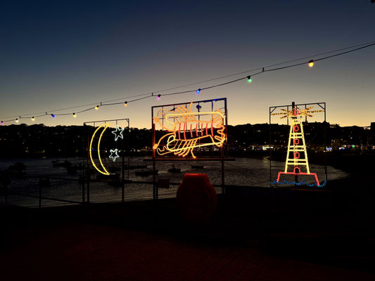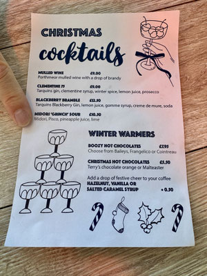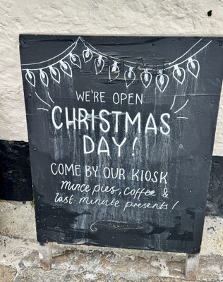 Spätestens am 24. Dezember hat hier jede Britin und jeder Brite den Weihnachtspulli montiert oder die Mütze mit Renntiergeweih aufgesetzt. Das gilt selbstverständlich auch für alle, die im Restaurant, in der Bäckerei oder sonst irgendwo arbeiten. Christmas Spirit kennt keine Grenzen. Wir stehen dem in nichts nach und ziehen selbstverständlich mit. H-P trägt seinen Weihnachtspulli mit einer ganzen Herde Hirsche spazieren. Ich hingegen musste kurzfristig umplanen: Mein Baumwoll-Weihnachtspulli war für draussen schlicht zu optimistisch gedacht. Amazon Prime mit next day delivery hat gerettet mit coolen Weihnachts-Pins. Also Mütze und Schal dekoriert und voilà: outdoor-tauglich, festlich und absolut Cornwall-kompatibel.