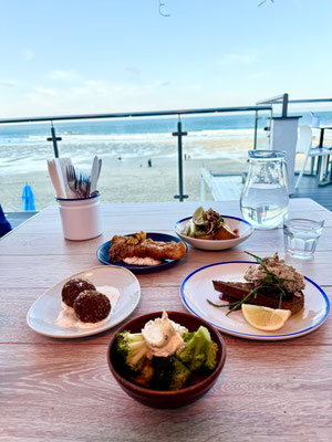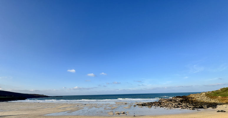 Vor uns: ein türkisblauer Atlantik und Sand, der locker als Karibik-Double durchgehen würde. Das Essen? Hervorragend. Wir entscheiden uns für Cornish Tapas das sind mehrere kleine, lokale