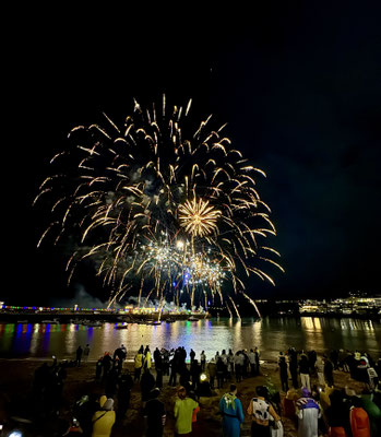 Richtung bestimmen? Zwecklos. Wir lassen uns treiben, mit allen 39’998 anderen. Dann: Jahreswechsel. Rund ums Hafenbecken. Erst jetzt wird uns bewusst, wie viele Menschen das wirklich sind. Gemeinsames Countdown-Rückwärtszählen und dann ein Feuerwerk, das absolutes Weltklasse-Niveau hat. Meine Güte! Sowas haben wir noch nie gesehen. Nicht einmal in den USA. Es fühlt sich an, als stünden wir alle mittendrin.