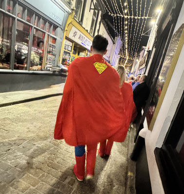 Nach dem Dinner geht’s nochmals kurz zurück in die Wohnung: mehr Kleider-Layers. Das Kostüm fühlt sich inzwischen an, wie eine Presswurst, aber tatsächlich passt nebst Merino-something nochmals eine Faserpelzjacke drunter. Zum Glück. Es ist sehr kalt und der Wind bissig. Und trotzdem laufen Leute in kurzen Hosen und T-Shirt herum. The Brits are made different.